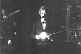 Частым ночным посетителем лаборатории Теслы был известный писатель Сэмюэль Клеменс, более известный под псевдонимом Марк Твен. Тесла был настолько близок с ним, что годами после его смерти говорил о нём, как о живом. Писатель Твен умер в 1910 году, и через шесть лет после этого была опубликована его загадочная новелла «Таинственный странник». В ней речь шла об ангеле, который сходит с неба в маленькое австрийское село, где он встречается с группой мальчишек, которых посвящает в тайны мироздания. Если маленькое австрийское село принять за Смиляны, а образ Ангела за Теслу, то возникает объяснение теории о человеческих судьбах и космологии, высказанной в этом коротком рассказе, заметно отличающемся от остальных рассказов писателя.