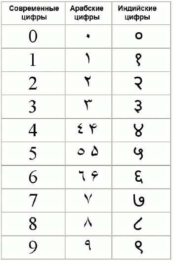 Современные, так называемые «арабские цифры» тоже возникли в Индии. Там же было открыто и формализовано понятие нуля (шунья), которое позволило перейти к позиционной записи чисел, и, которого не было у других народов. Арабские цифры являются всего лишь видоизменёнными начертаниями индийских цифр, приспособленными к арабскому письму. Абу Джафар Мухаммад ибн Муса Аль-Хорезми, автор знаменитой работы «Китаб аль-джебр ва-ль-мукабала», от названия которой произошёл термин «алгебра», широко популяризировал индийскую систему записи. Он написал книгу «Об индийском счёте», способствовавшую распространению десятичной позиционной системы записи чисел во всём Халифате, вплоть до Мусульманской Испании.